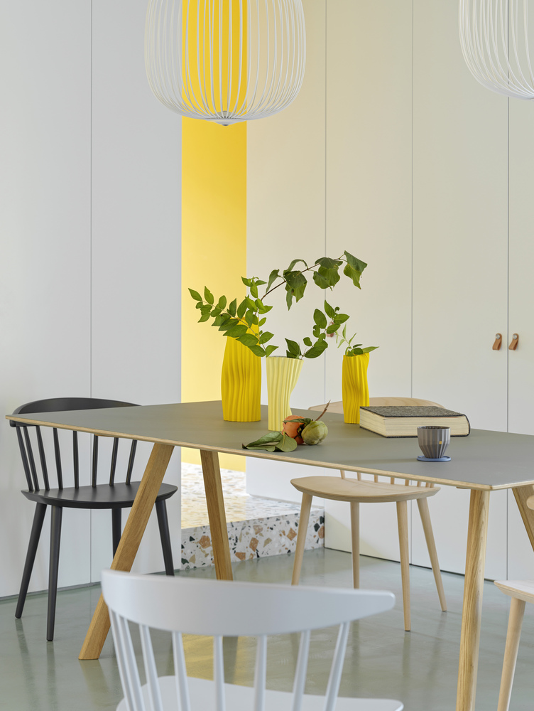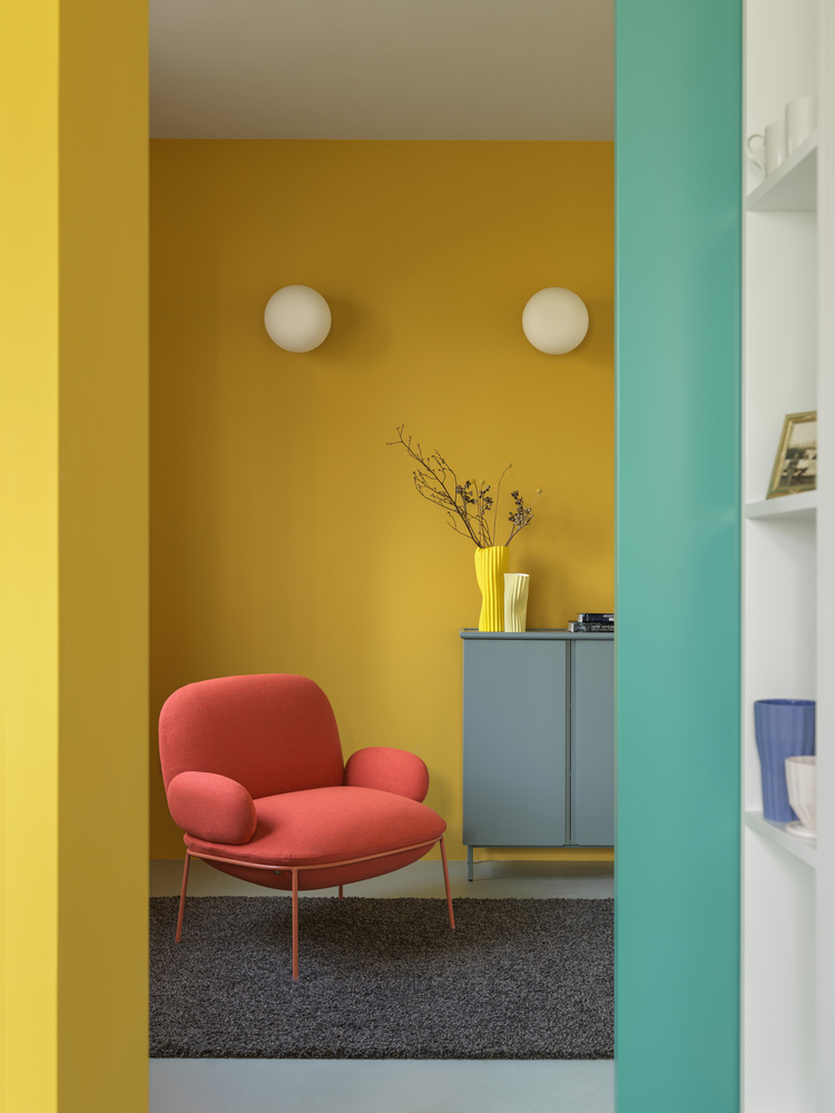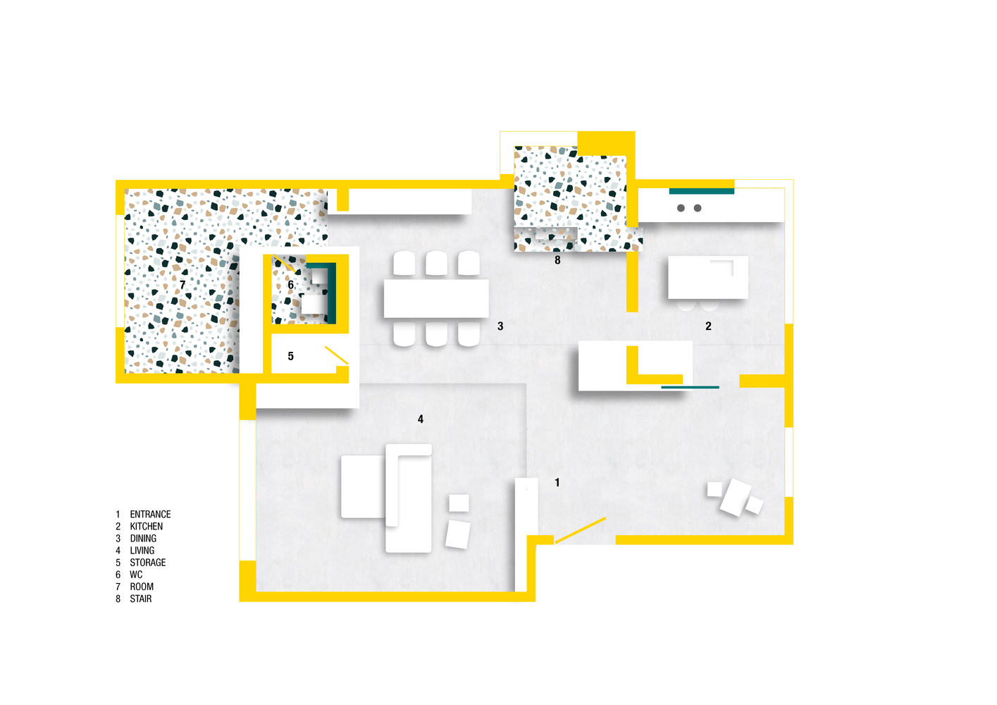 Căn hộ được thiết kế theo phong cách Minimalism với bảng màu thể hiện năng lượng của gia đình trẻ. Sàn và trần nhà được làm bằng xi măng. Các vách với nhiều màu sắc khác nhau được lồng ghép với tông chính là màu vàng. Tất cả kết hợp mang lại một không gian tràn đầy năng lượng cho ngôi nhà. Đảo bếp, phòng chơi và bục dưới chân cầu thang được phối màu đầy ấn tượng, tạo ra sự cuốn hút riêng biệt.