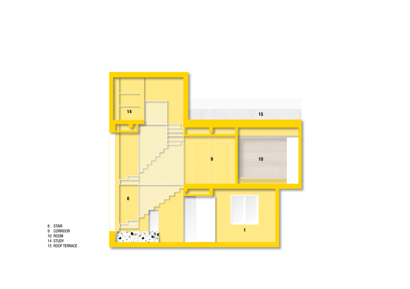 Tầng đầu tiên của căn hộ được mở rộng toàn bộ không gian nhằm tạo một không gian sinh hoạt chung. Cầu thang đã bị phá hủy và các bức tường phân vùng cũng đã được đập bỏ. Một số bức tường cấu trúc đã được đục lỗ để tạo sự liên kết giữa các khu vực.