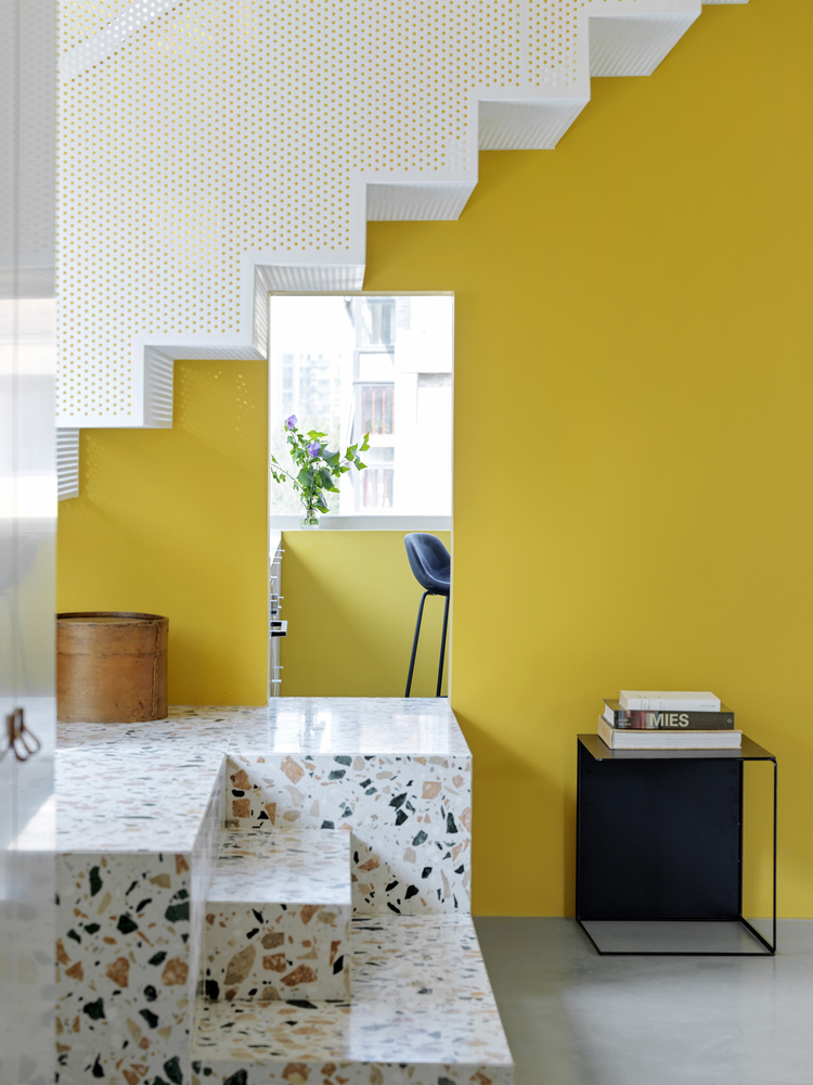 Tổng thể không gian là một dòng chảy liên tục giữa các phòng với nhau. Để làm sáng thêm không gian, một cầu thang mới đã được lắp bằng các tấm thép trắng đục lỗ. Bề mặt của cầu thang tận dụng tối đa ánh sáng tự nhiên từ các cửa sổ chiếu xuyên thấu vào nhà. Vào buổi chiều muộn, bóng của cầu thang tạo ra điểm nhấn nổi bật bên trong căn hộ.