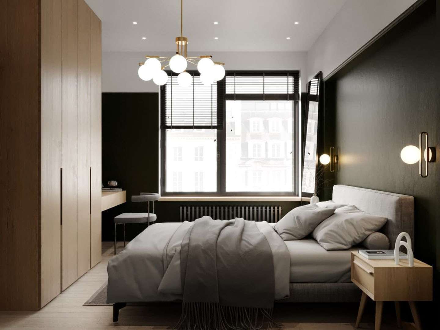 Thiết kế nội thất phòng ngủ đơn giản nhưng đầy ấn tượng với mảng tường màu xanh đậm kết hợp với hệ thống đèn chiếu và đồ decor làm nổi bật cả không gian. Tuy có thiết kế đơn giản nhưng tổng thể không gian phòng ngủ vẫn rất tinh tế và tiện nghi, tối ưu diện tích không gian.