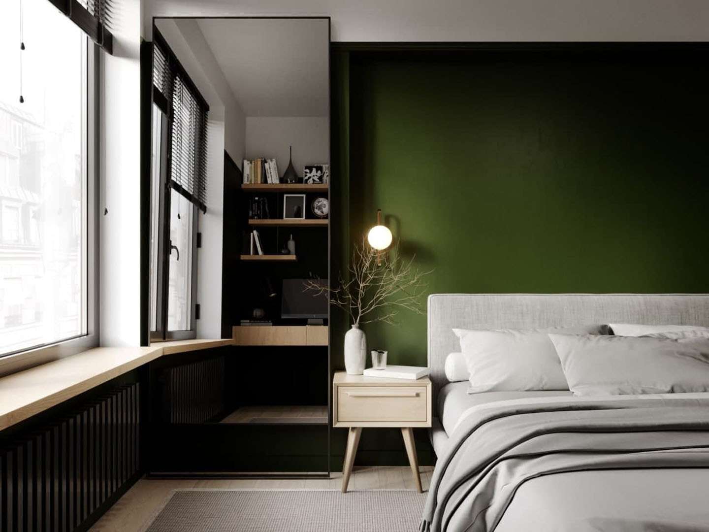 Thiết kế nội thất phòng ngủ đơn giản nhưng đầy ấn tượng với mảng tường màu xanh đậm kết hợp với hệ thống đèn chiếu và đồ decor làm nổi bật cả không gian. Tuy có thiết kế đơn giản nhưng tổng thể không gian phòng ngủ vẫn rất tinh tế và tiện nghi, tối ưu diện tích không gian.