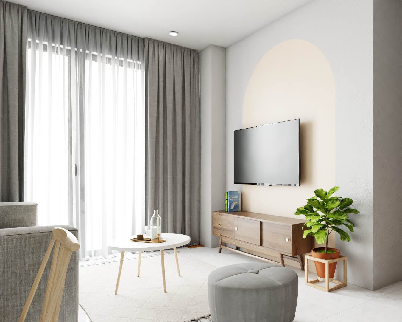 Căn phòng tận dụng tối đa ánh sáng tự nhiên từ bên ngoài làm chủ đạo cho toàn bộ không gian. Thay vì kết hợp quá nhiều thiết kế sẽ dựa vào ánh sáng ban ngày và đồ nội thất cung cấp sự ấm áp. Khi ánh sáng là trục chính của không gian kết hợp với nền gạch trắng giúp tăng cường ánh sáng trong nhà. Với sơn màu xám kem và ghế sofa màu xám nhạt tạo nên không gian phòng khách êm dịu, nhẹ nhàng.