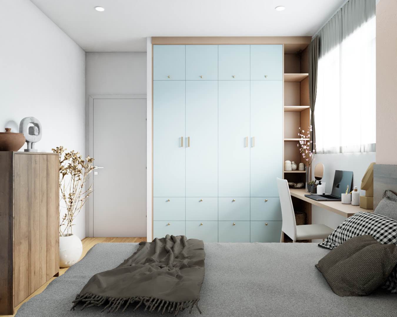 Đáp ứng sở thích và nhu cầu của gia chủ với thiết kế đơn giản, phòng ngủ được trang trí bằng nội thất vật liệu gỗ dưới ánh sáng chan hòa, ấm áp. Tủ quần áo đa năng và tiện dụng, giúp tối ưu diện tích không gian.