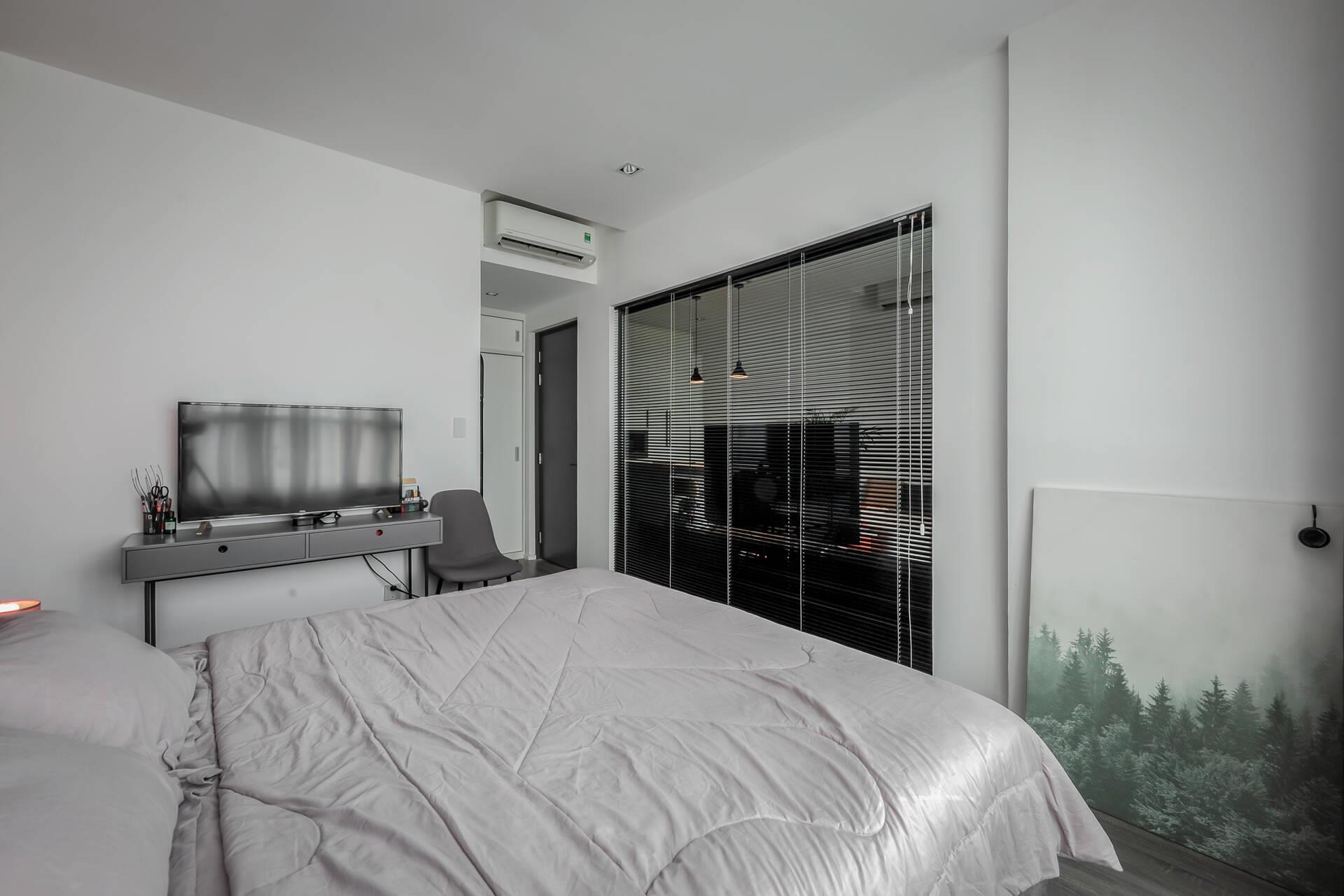 Thiết kế phòng ngủ nhẹ nhàng, ấm áp với tone màu xám kết hợp ánh sáng tự nhiên bên ngoài, tạo không gian thư giãn và thoải mái.