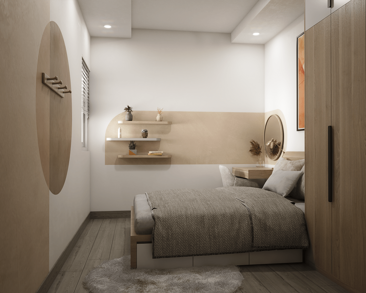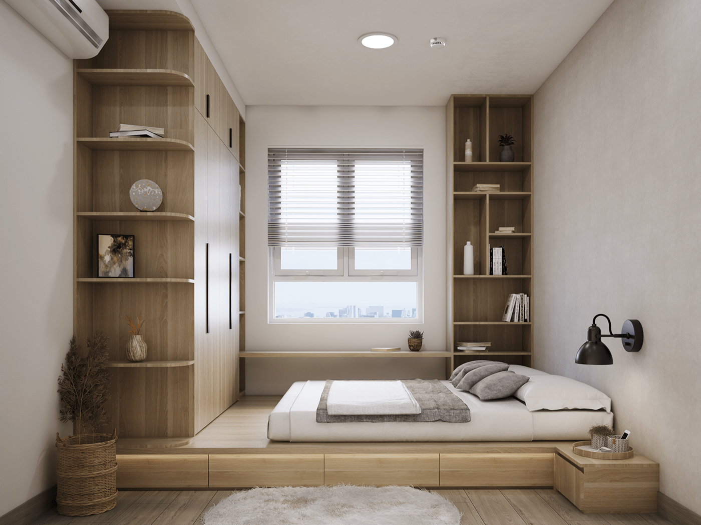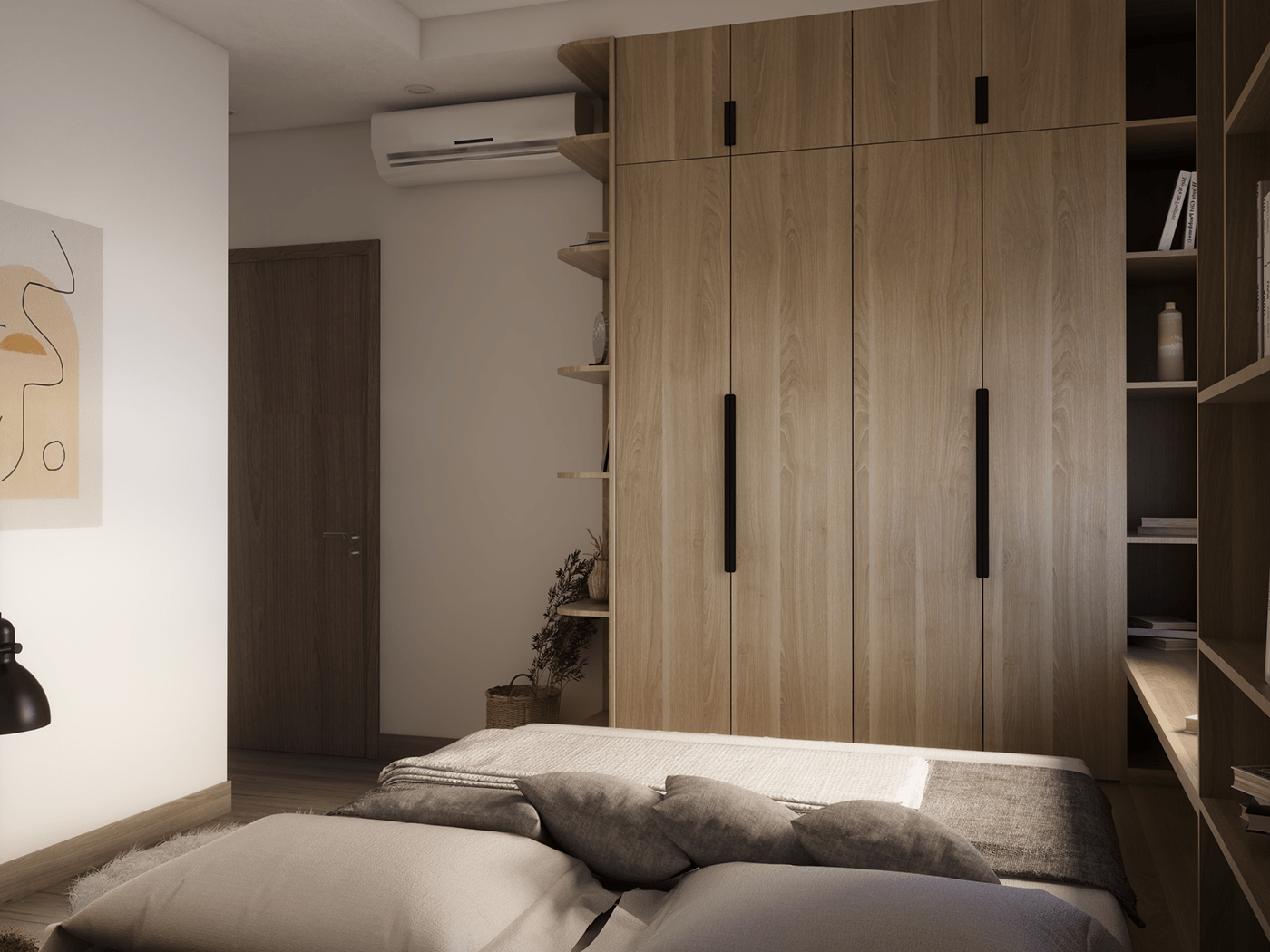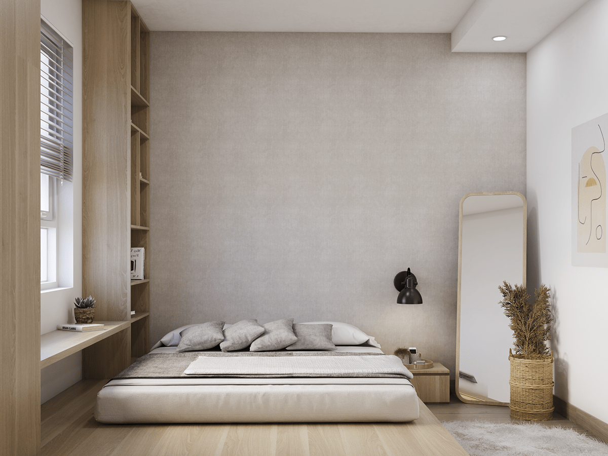 Thiết kế phòng ngủ nhẹ nhàng, ấm áp, kết hợp với ánh sáng tự nhiên bên ngoài, tạo không gian thư giãn và thoải mái. Bố trí nội thất hợp lý, khoa học và tiện nghi, giúp tối ưu diện tích không gian.
