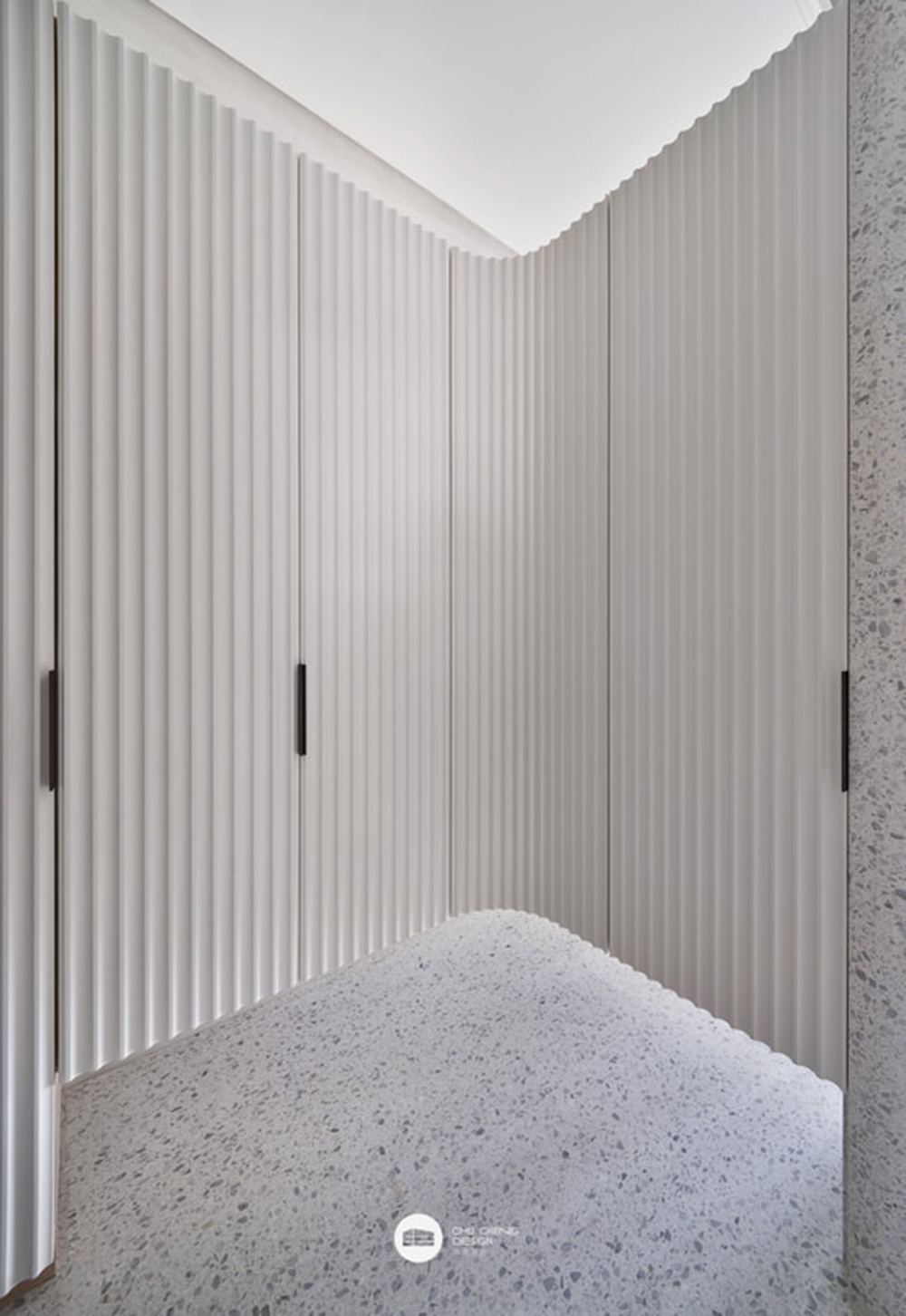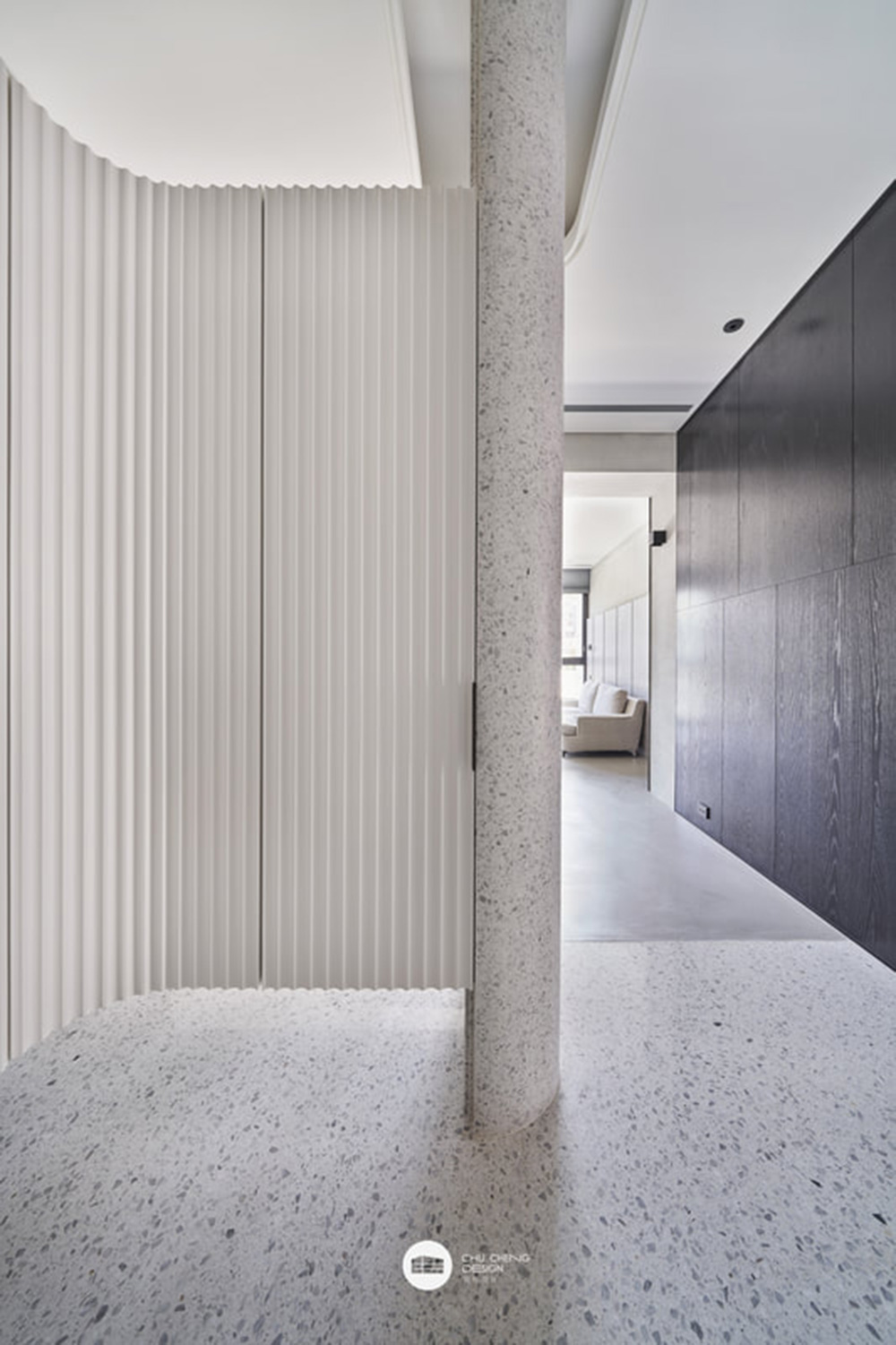 Để xác định không gian giữa tiền sảnh và phòng khách, thiết kế sử dụng kỹ thuật phân chia không gian chuyển tiếp với các cột đá terrazzo và khéo léo kết hợp ánh sáng qua qua từng không gian.